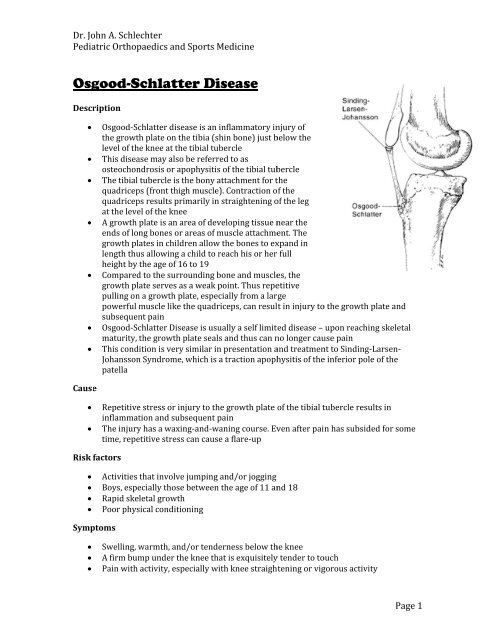 Mar 31, 2022 · Osgood-Schlatter disease refers to osteochondrosis and inflammation of the tibial tubercle. It occurs in children between 10 years and 15 years of age and is usually unilateral.